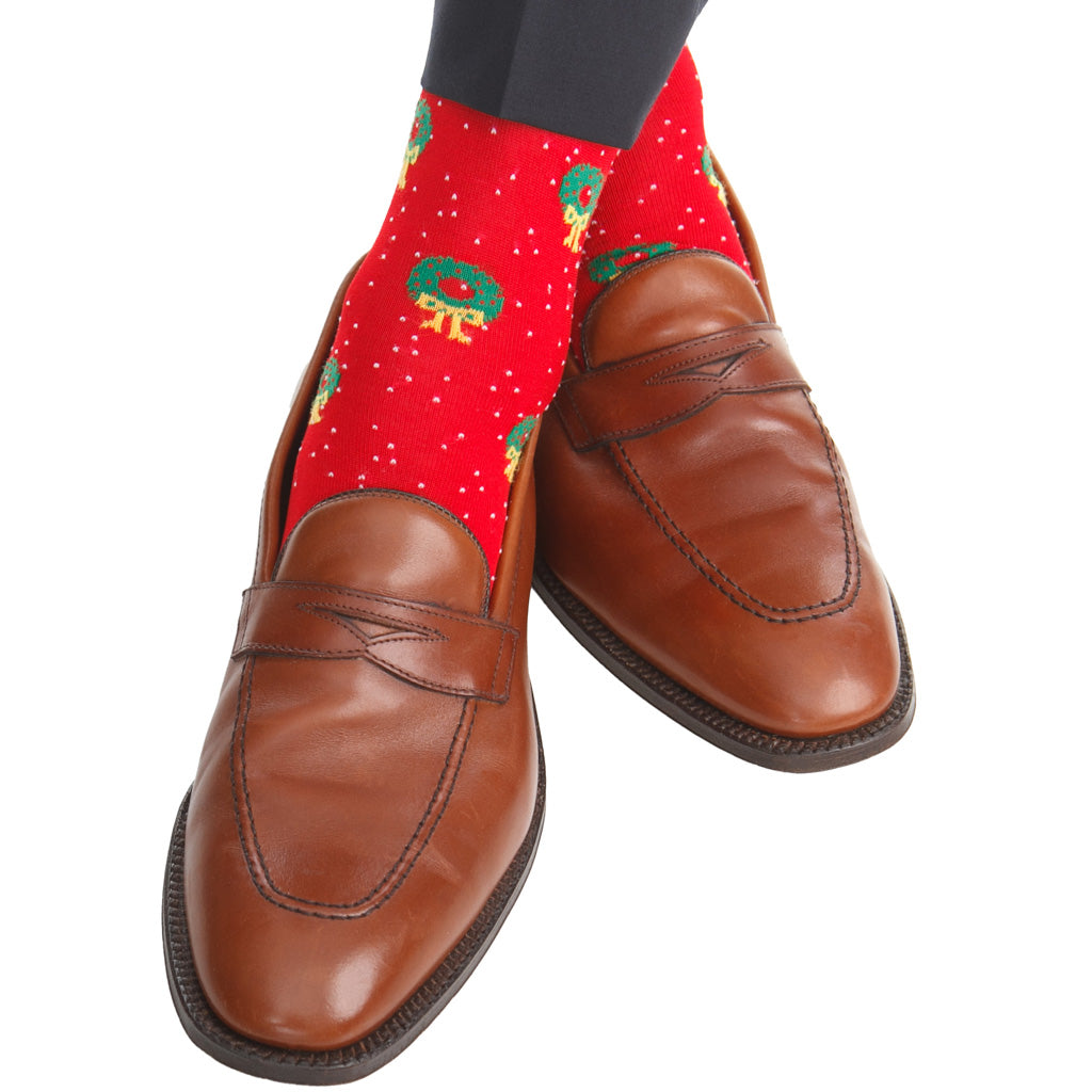 Red with White Pin Dots & Holiday Wreaths Cotton Sock Linked Toe Mid-Calf
