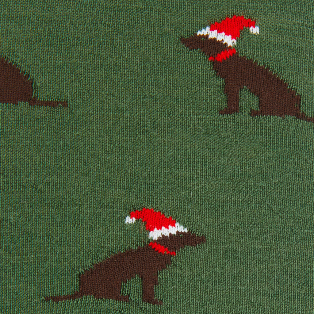 Pine Green with Brown Dog in Santa Hats Fine Merino Wool Sock Linked Toe OTC