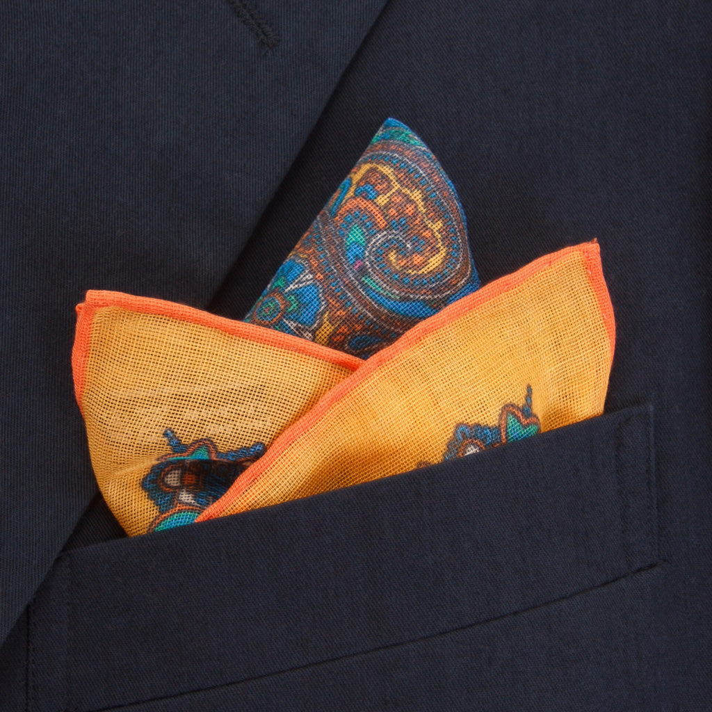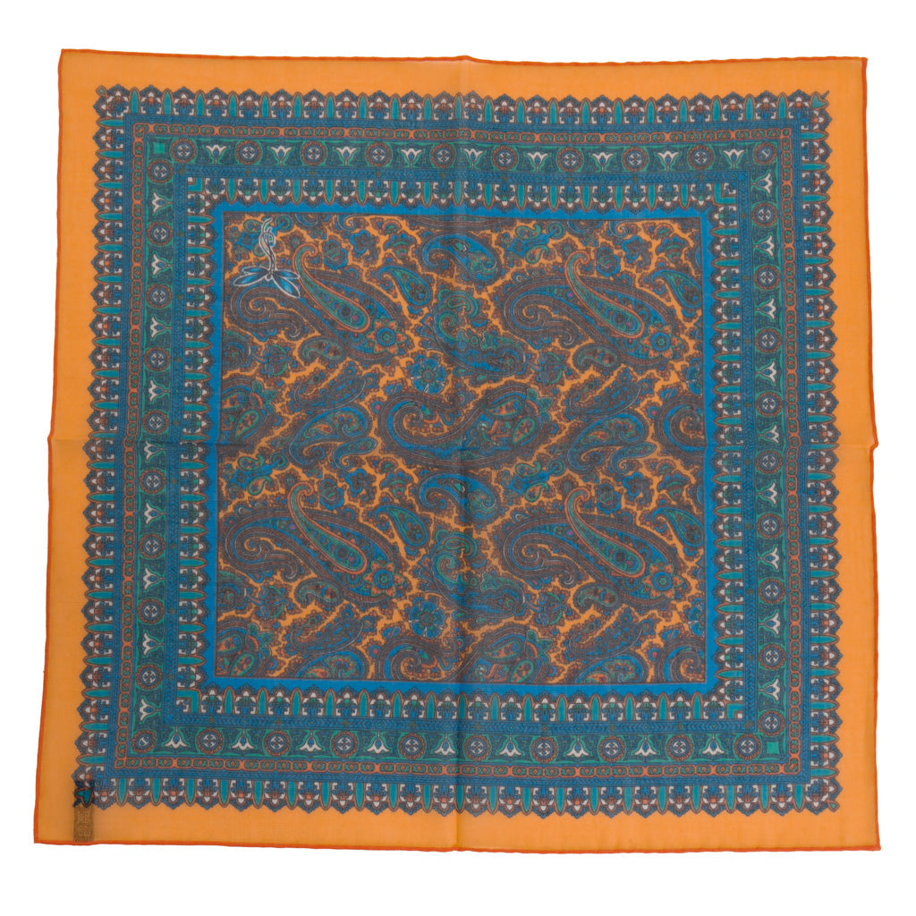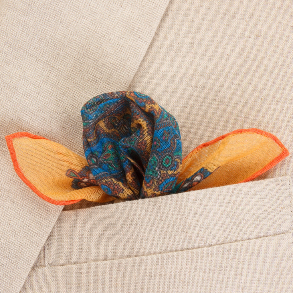 This pocket square is crafted from a luxurious blend of cotton, modal and cashmere, offering a soft, lightweight feel with a refined drape.  Designed in a small village in England, it reflects an exceptional craftsmanship and attention to detail.  The design features a vibrant bright blue base accented with yellow, green and aqua paisleys that feels both artistic and timeless.  Elegant yet expressive, this pocket square adds depth, character, and a distinctive finishing touch to any tailored look.