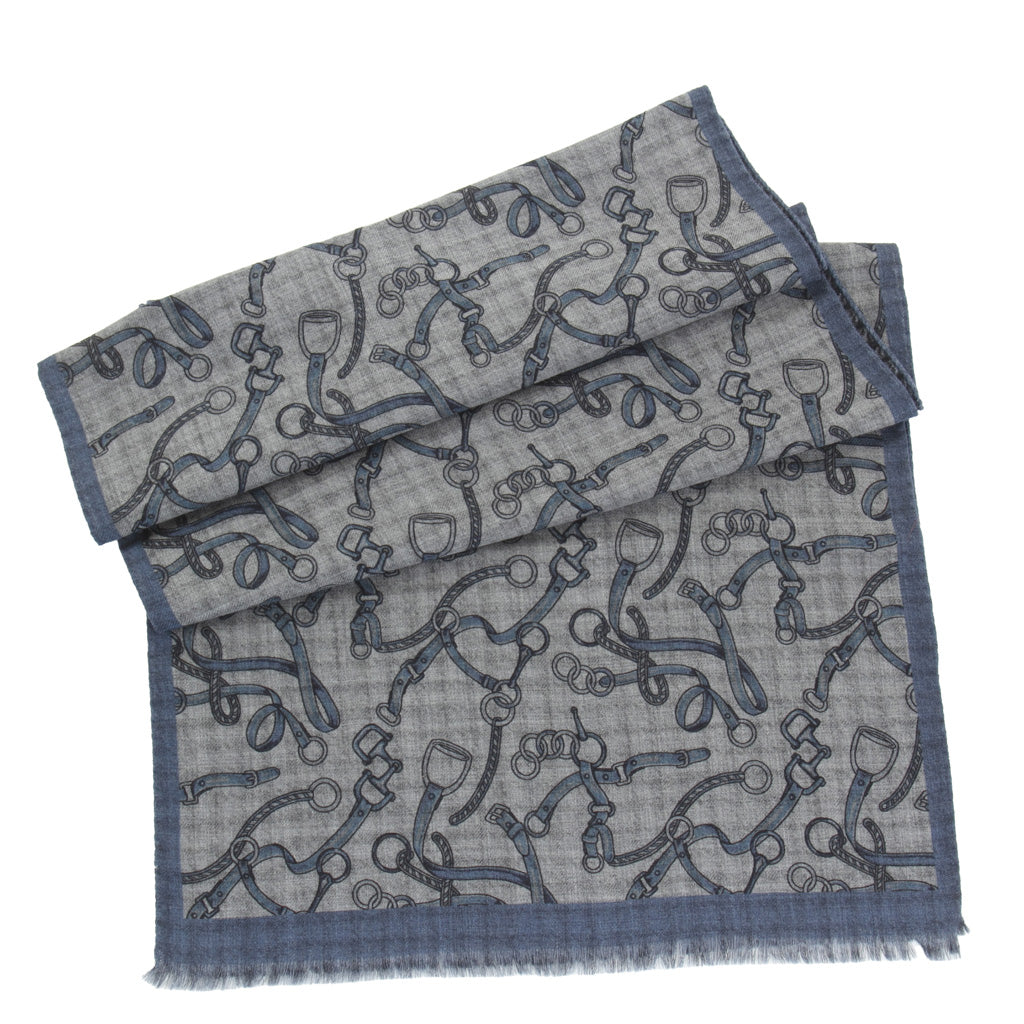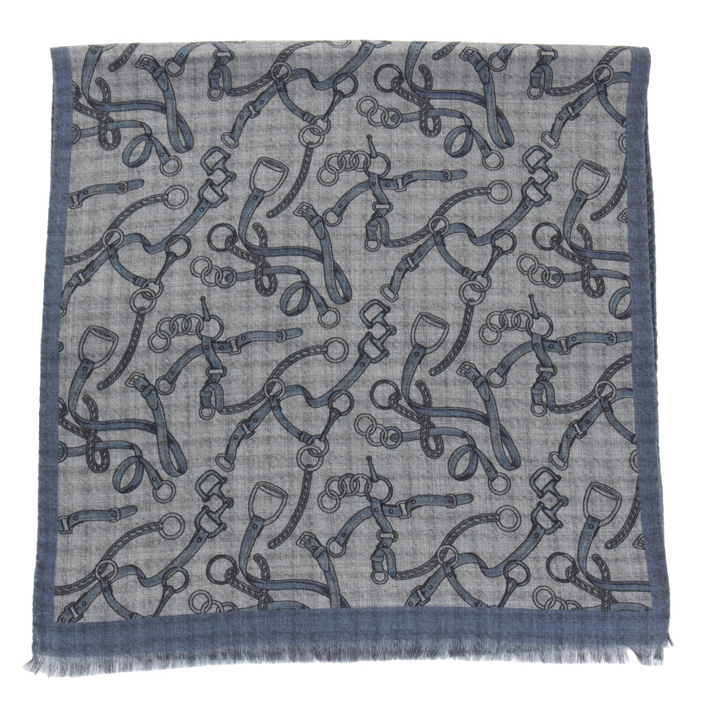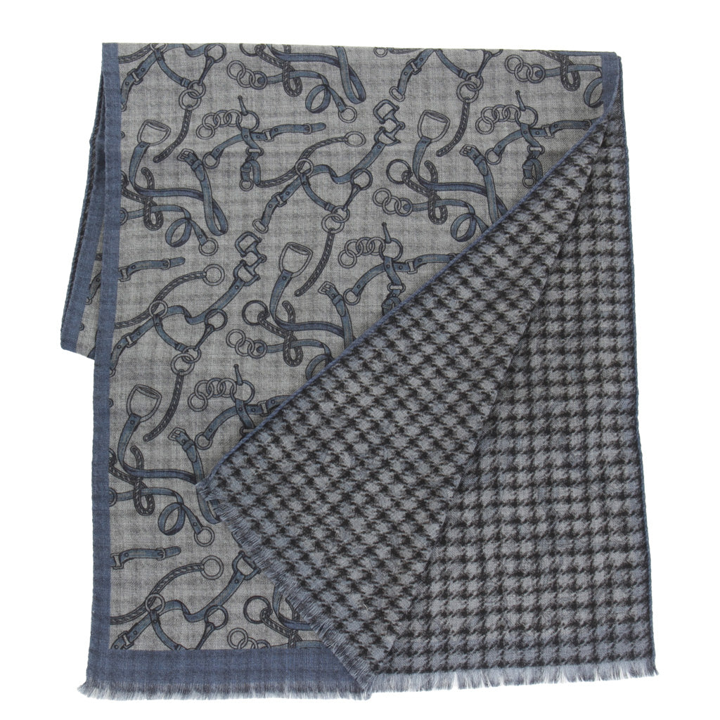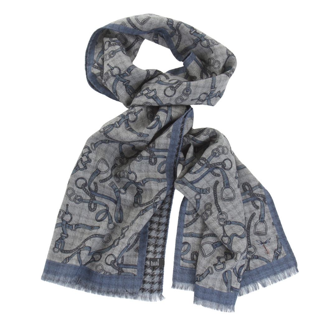 Dapper Classics scarves are woven in Como and printed on Fine Italian Lana Wool. This style is reversible with horse bits and bridles on one side and houndstooth on the other. This limited run equestrian scarf pattern is in charcoal and denim, making it a stylish and versatile accessory for cooler weather.