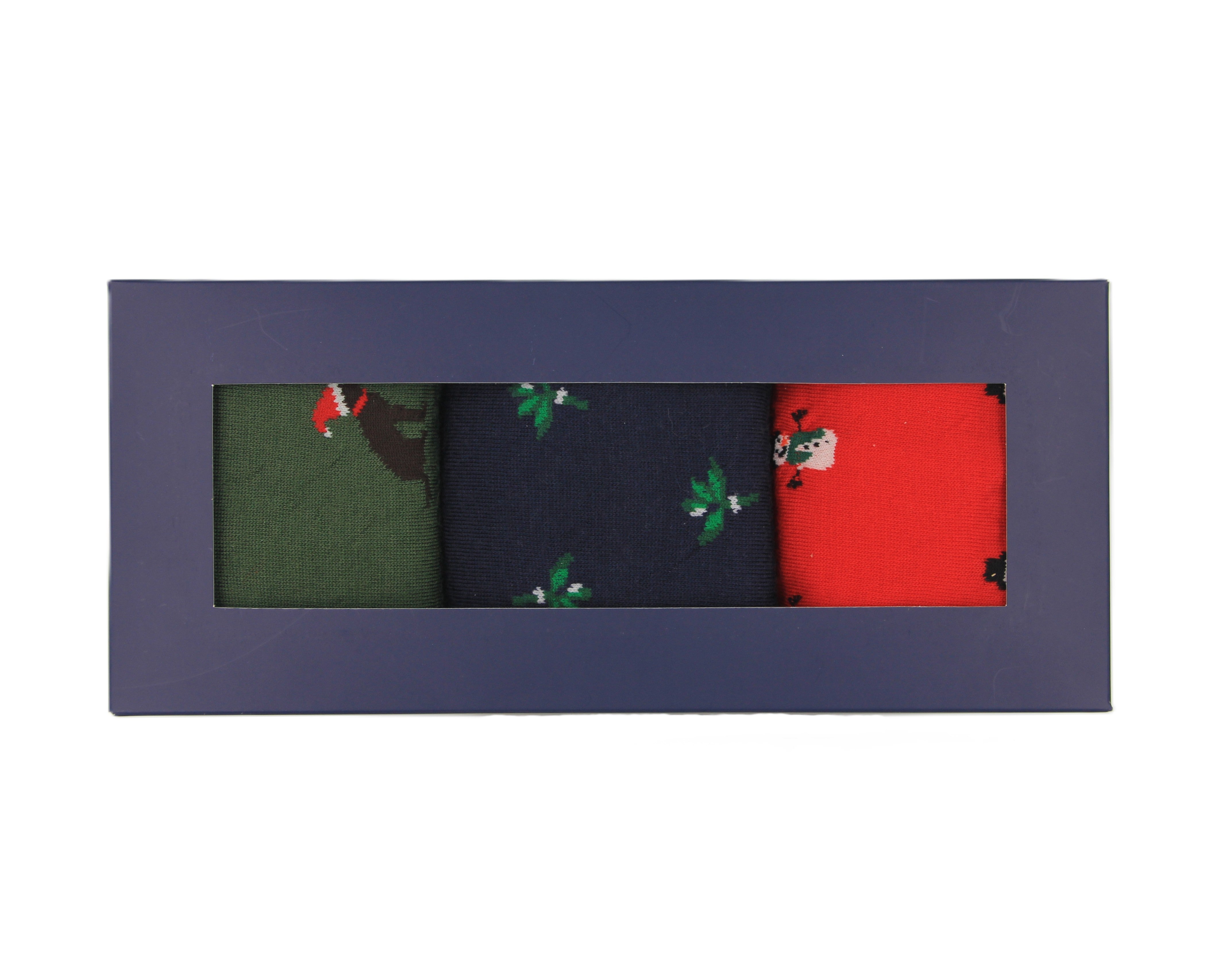 Enjoy this Christmas box set of warm wool socks featuring cozy, heart-of-the-holiday motifs to keep feet festive and comfortable. More specifically, this box set includes our "Pine Green with Brown Dog in Santa Hats", "Dress Navy with Green Mistletoe", and "Red with Snowmen" over-the-calf socks.