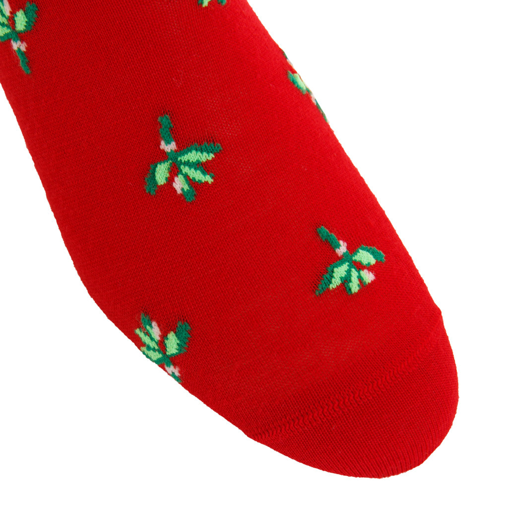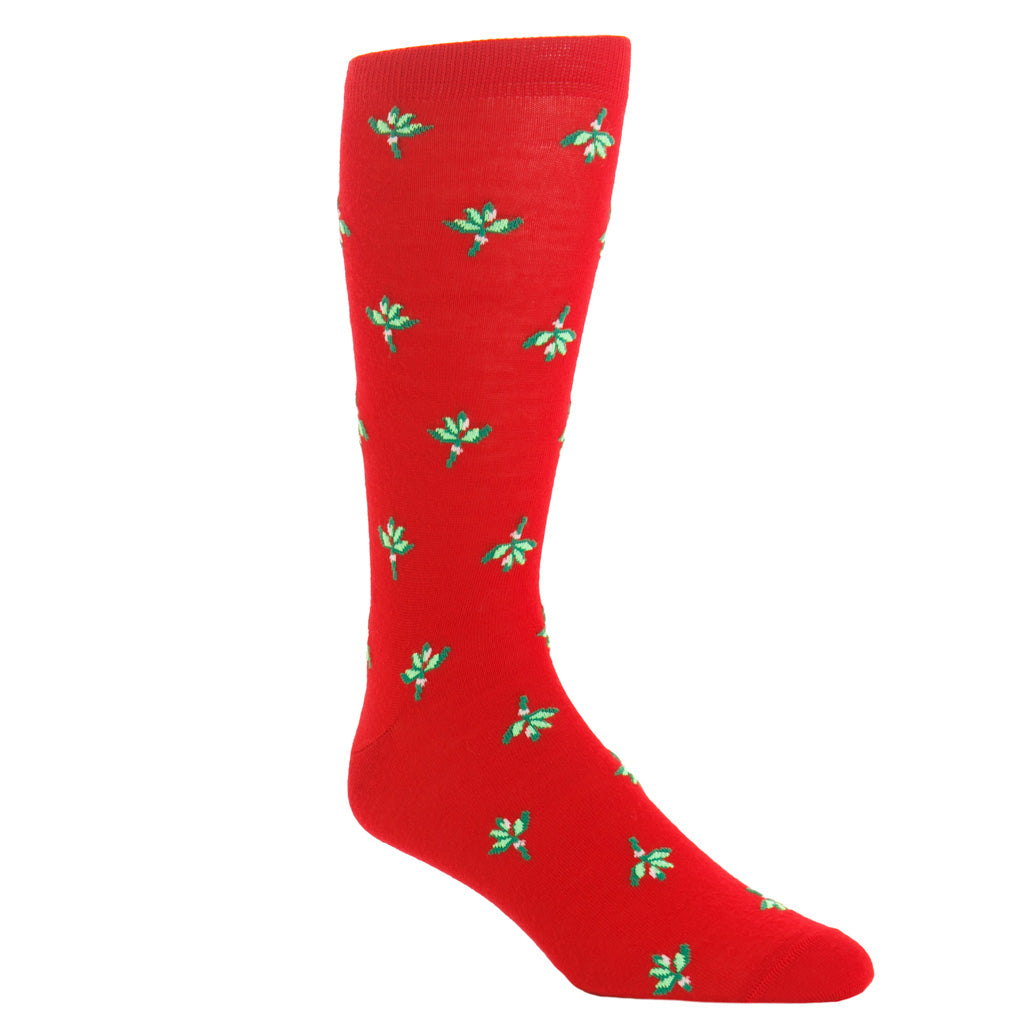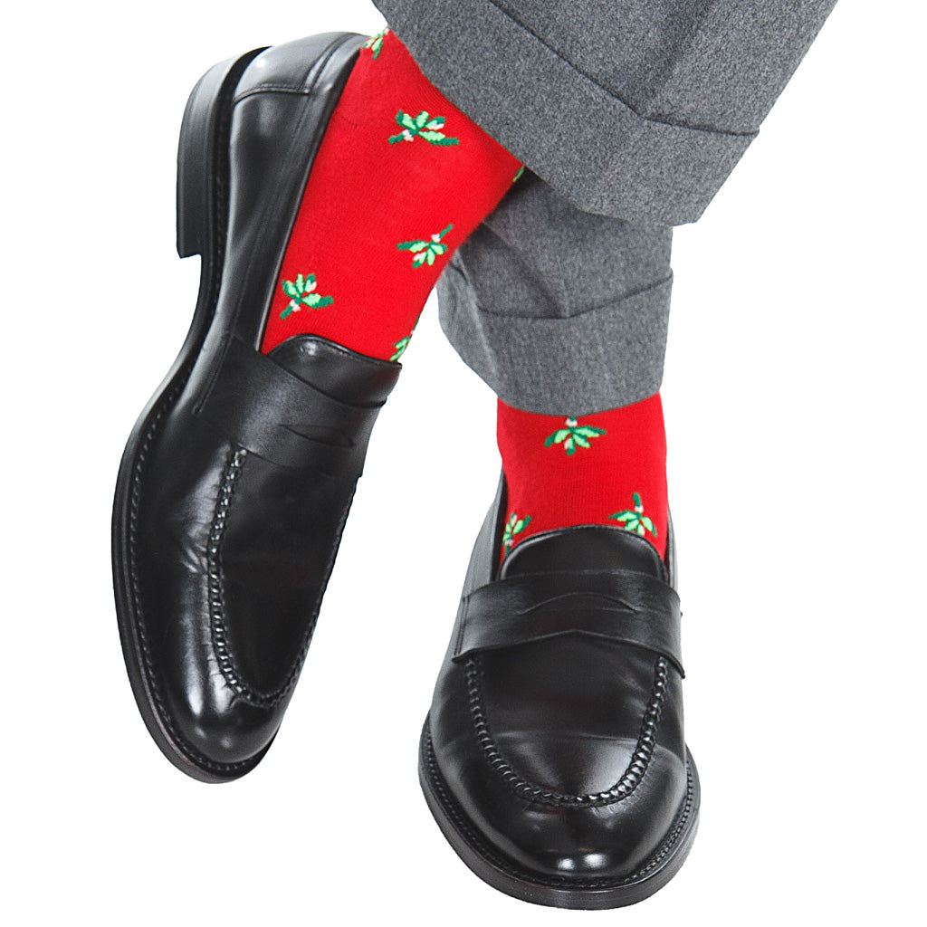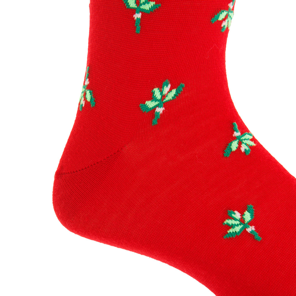 Red with Green, Pine Green, and White Mistletoe Cotton Sock Linked Toe Mid-Calf