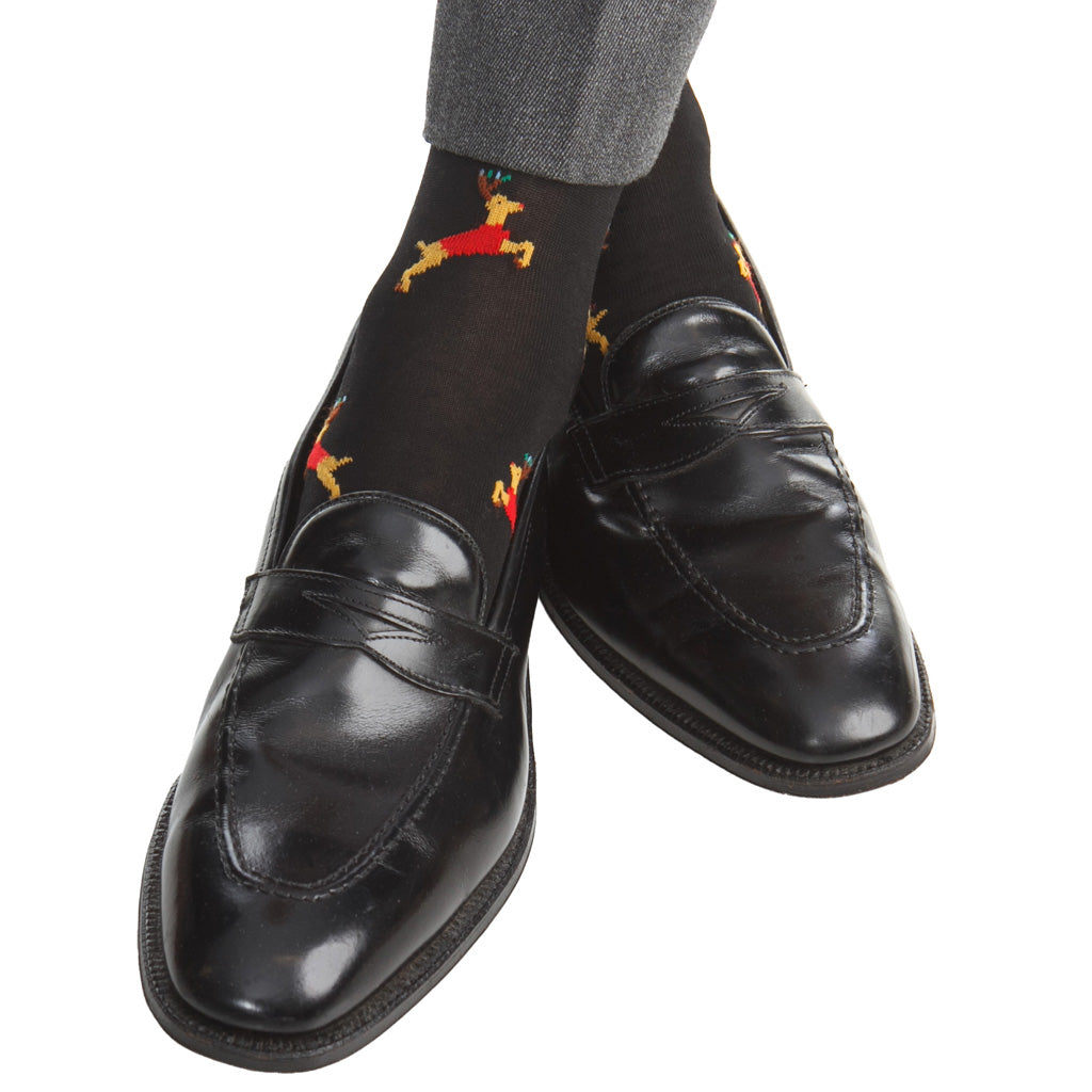Black with Dashing Reindeer Cotton Sock Linked Toe Mid-Calf