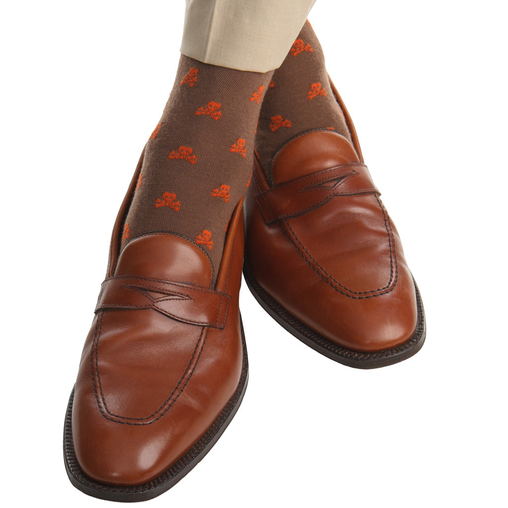 Coffee Brown with Burnt Orange Skull and Crossbones Fine Merino Wool Sock Linked Toe Mid-Calf