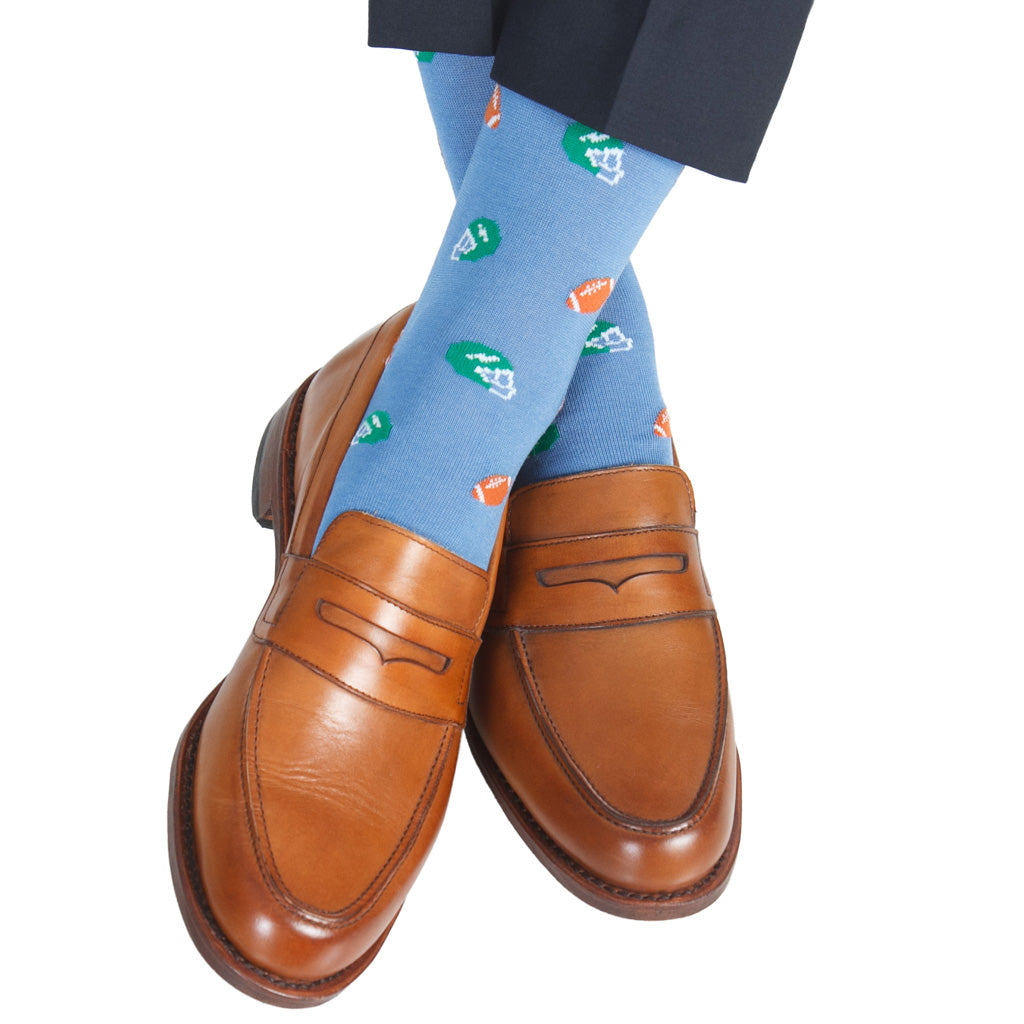 Azure with Green Helmet & Footballs Cotton Sock Linked Toe Mid-Calf