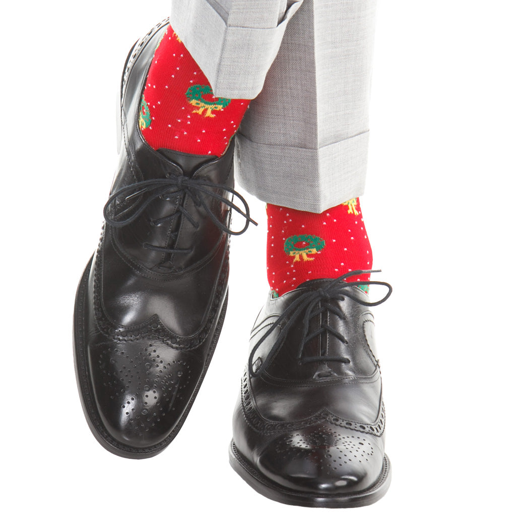 Red with White Pin Dots & Holiday Wreaths Cotton Sock Linked Toe OTC