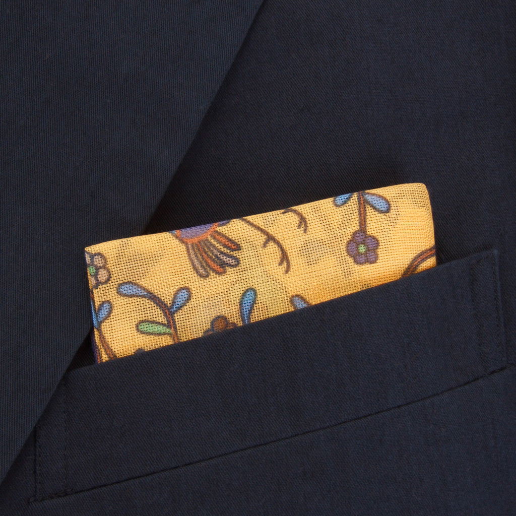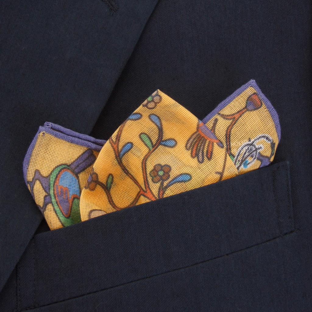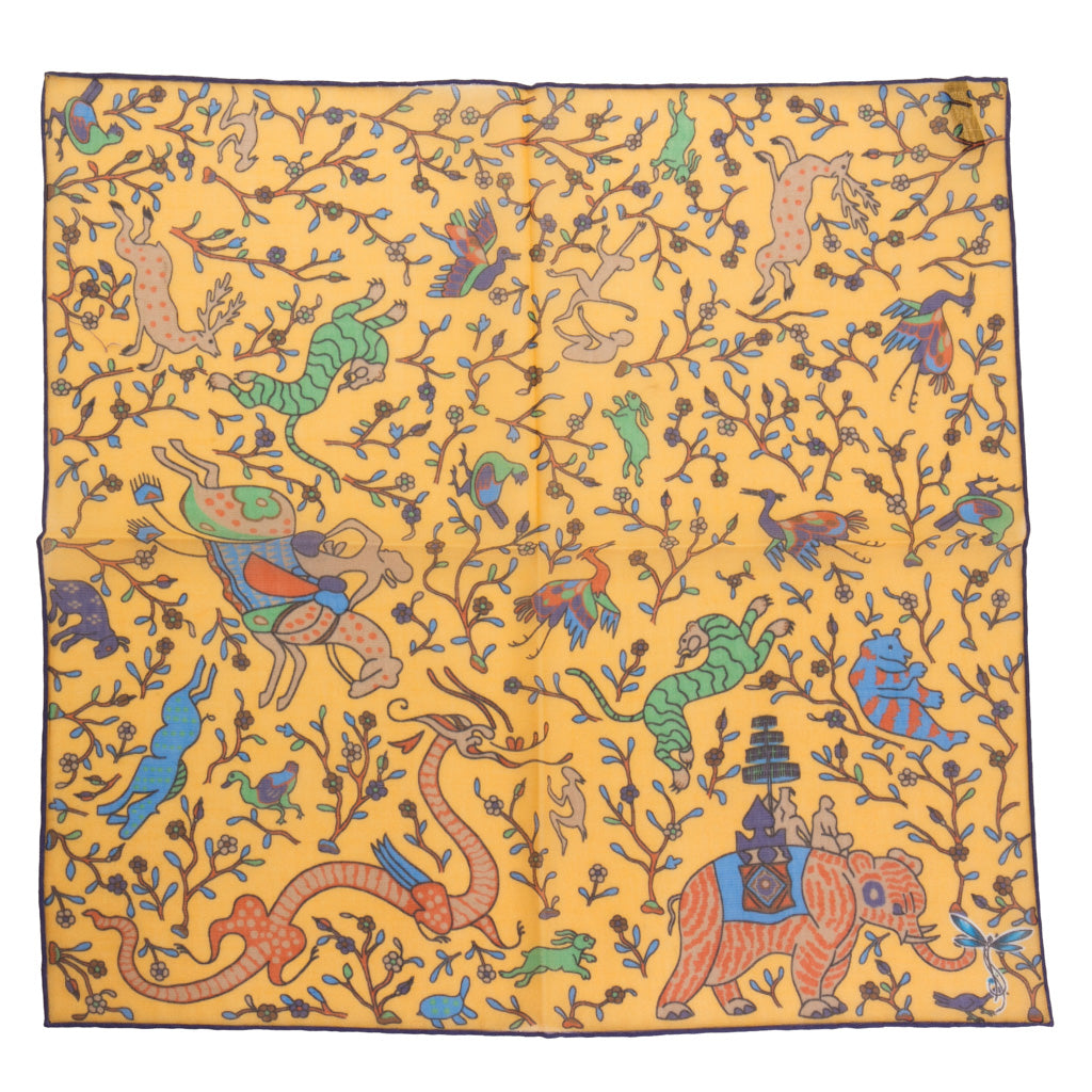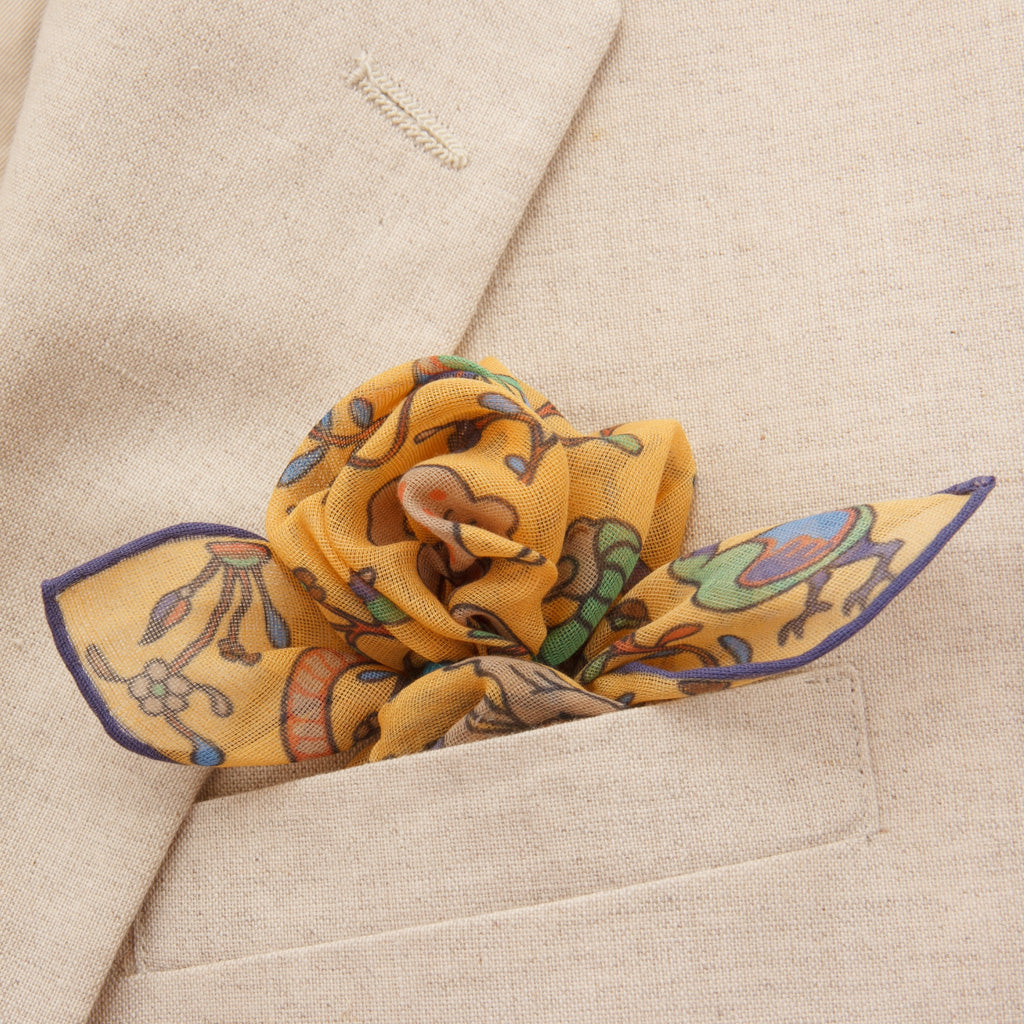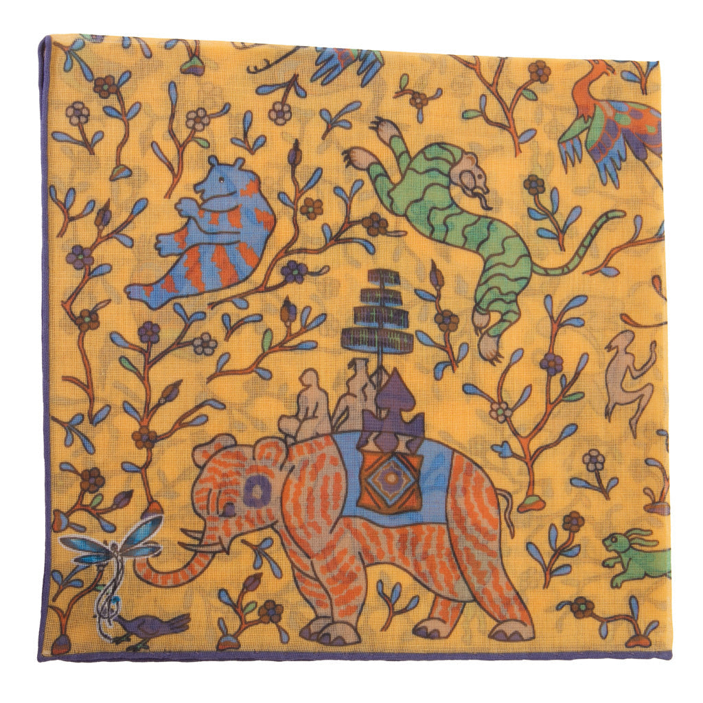 This pocket square is crafted from a luxurious blend of cotton, modal and cashmere, offering a soft, lightweight feel with a refined drape.  Designed in a small village in England, it reflects an exceptional craftsmanship and attention to detail.  The design features a rich, imaginative pattern of elephants, trojan horses, monkeys, and graceful floral branches, creating a narrative-inspired motif that feels both artistic and timeless.  Elegant yet expressive, this pocket square adds depth, character, and a distinctive finishing touch to any tailored look.