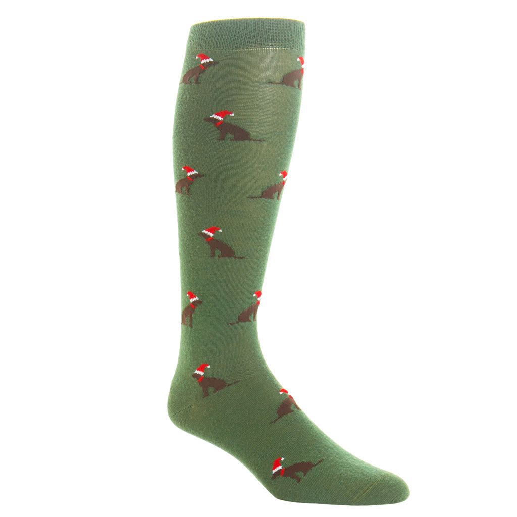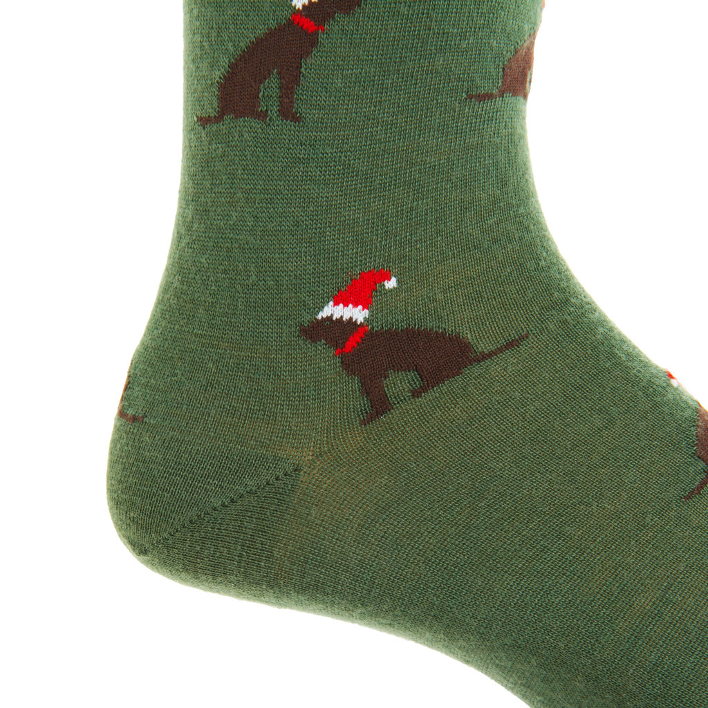Pine Green with Brown Dog in Santa Hats Fine Merino Wool Sock Linked Toe OTC